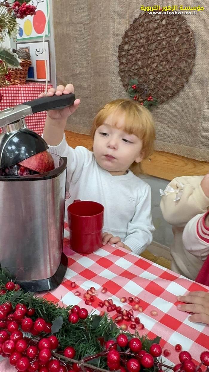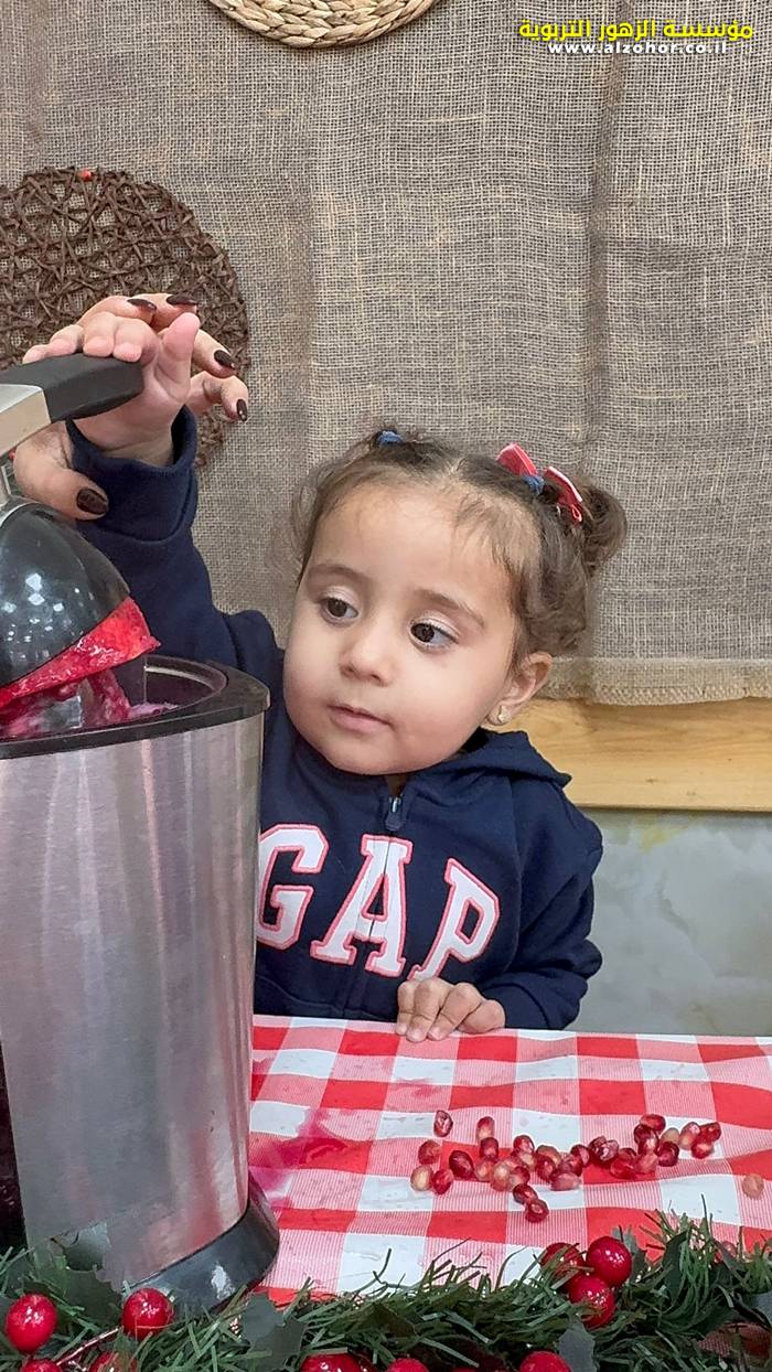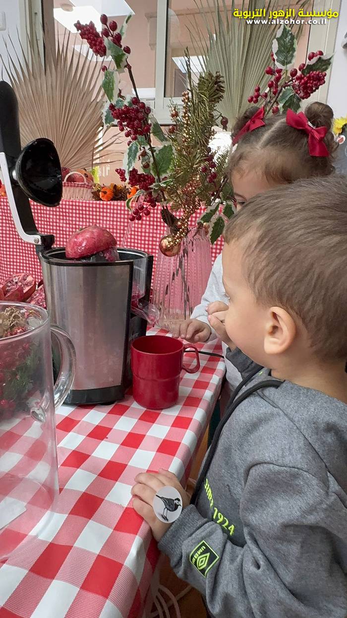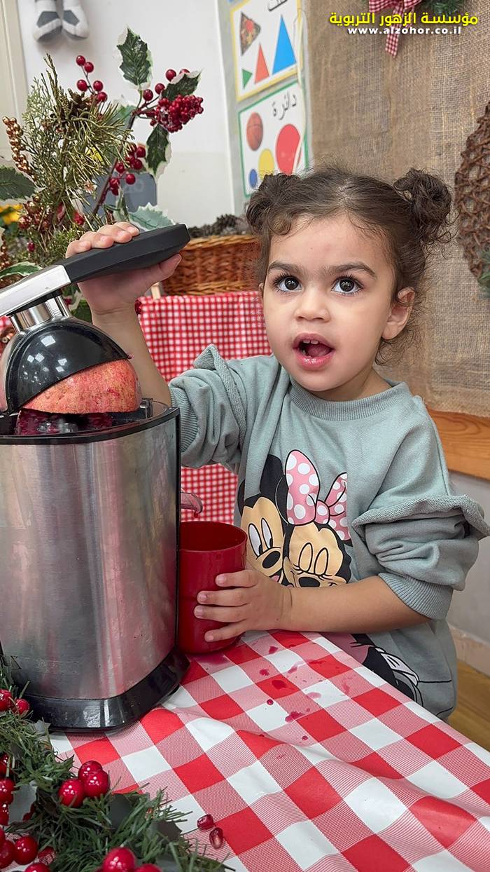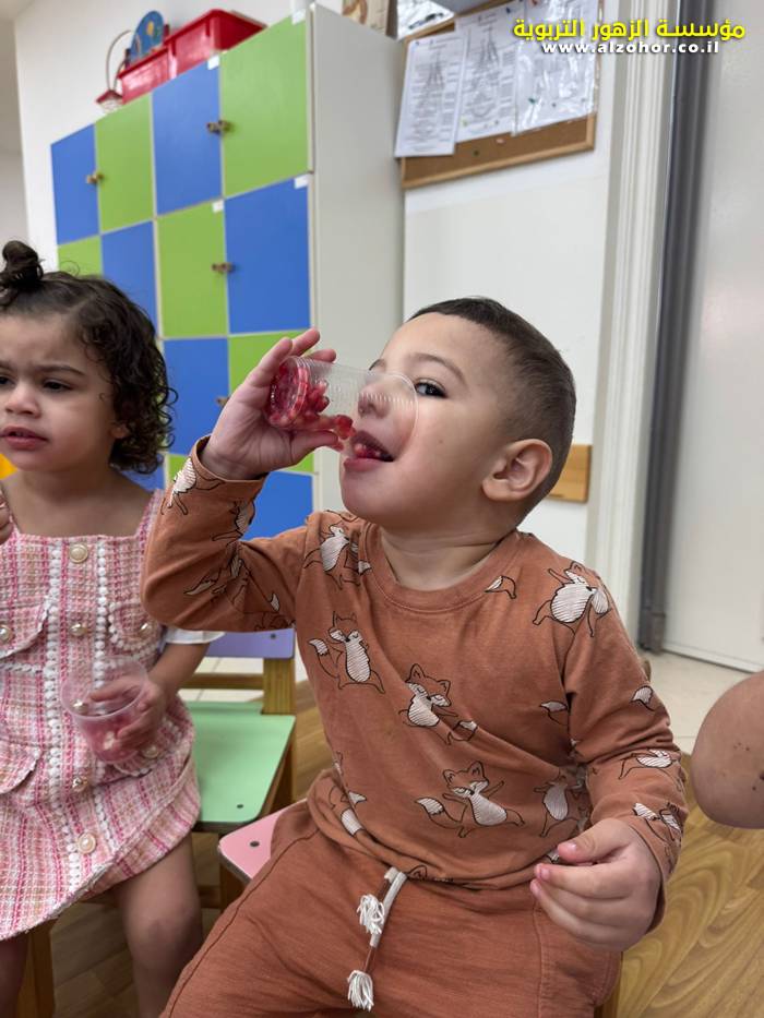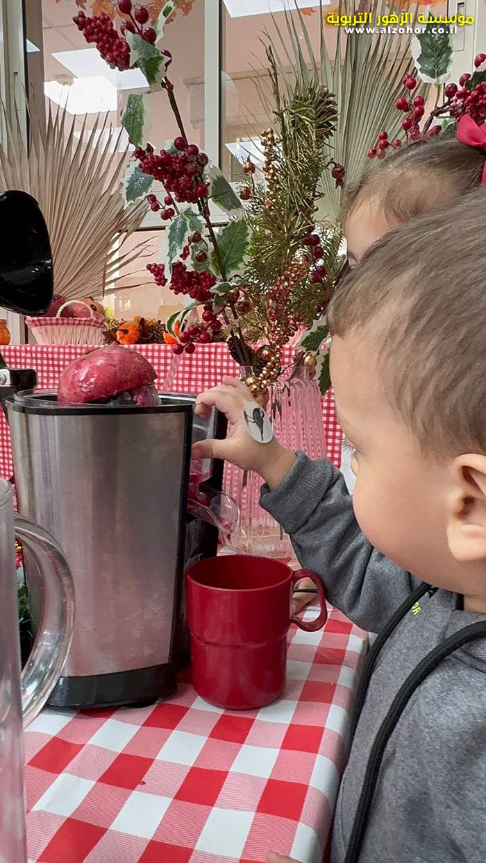 بعدها قام الأطفال بعصر حبات الرمان بأيديهم الصغيرة بكل فرح وحماس، وتذوقوا عصيرًا طبيعيًا طازجًا من صنع أيديهم 🍹