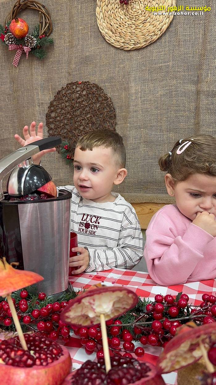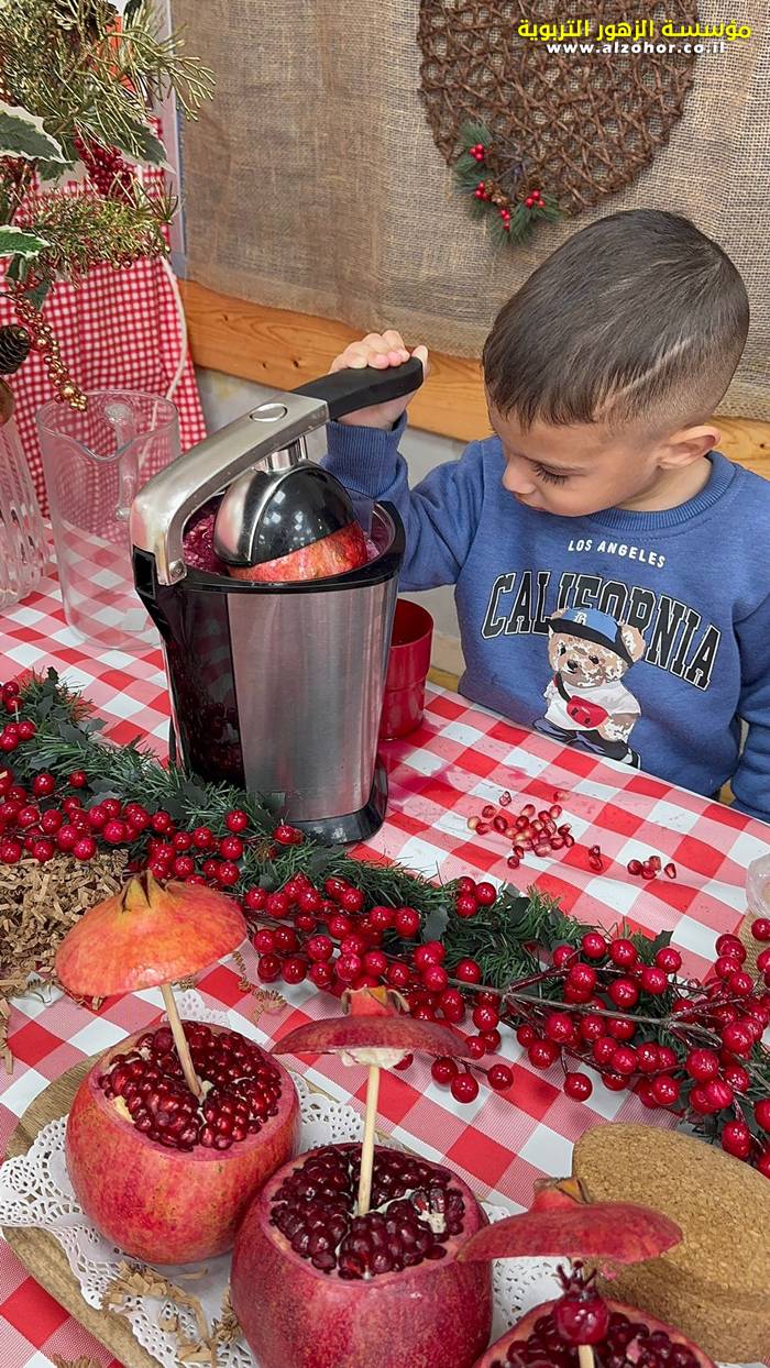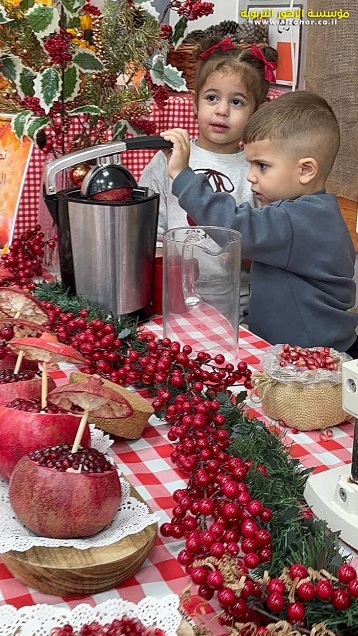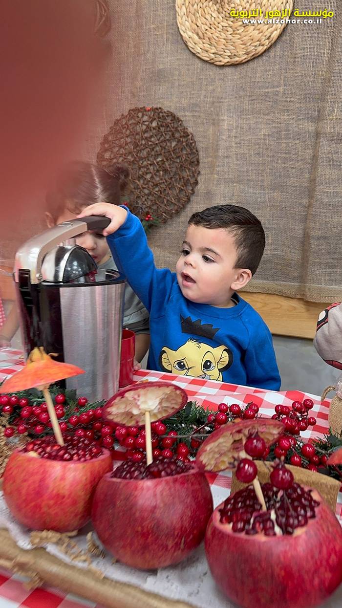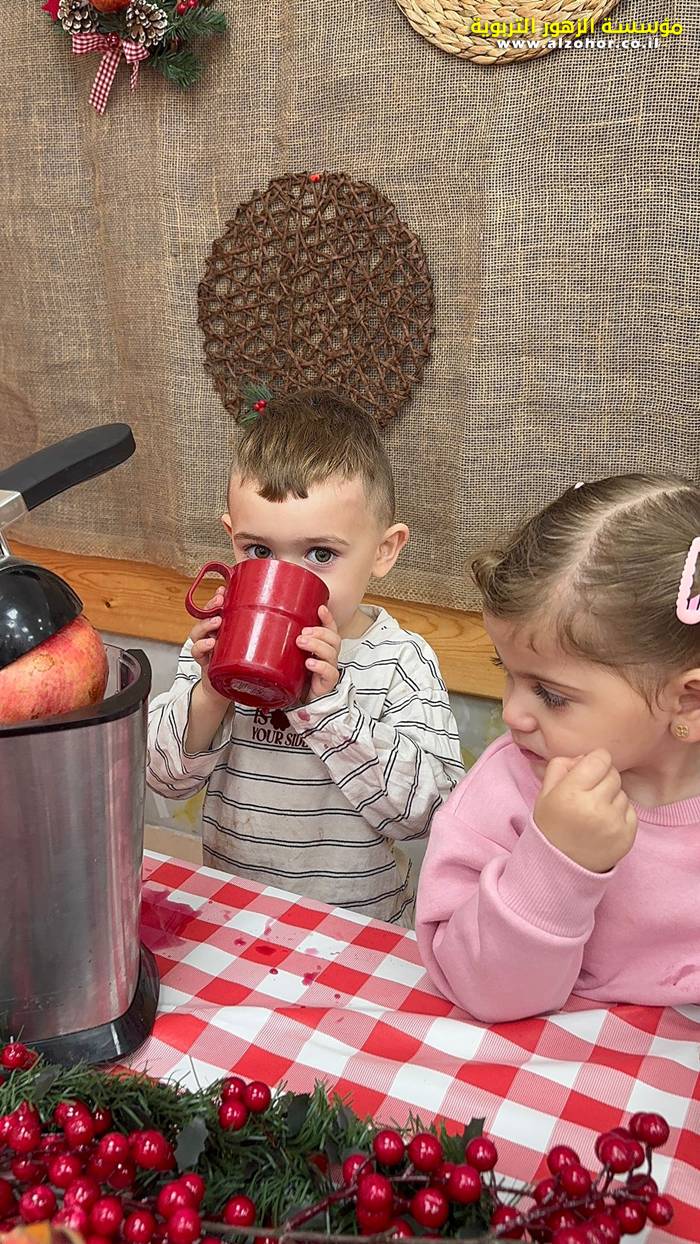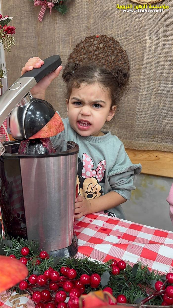 بعدها قام الأطفال بعصر حبات الرمان بأيديهم الصغيرة بكل فرح وحماس، وتذوقوا عصيرًا طبيعيًا طازجًا من صنع أيديهم 🍹