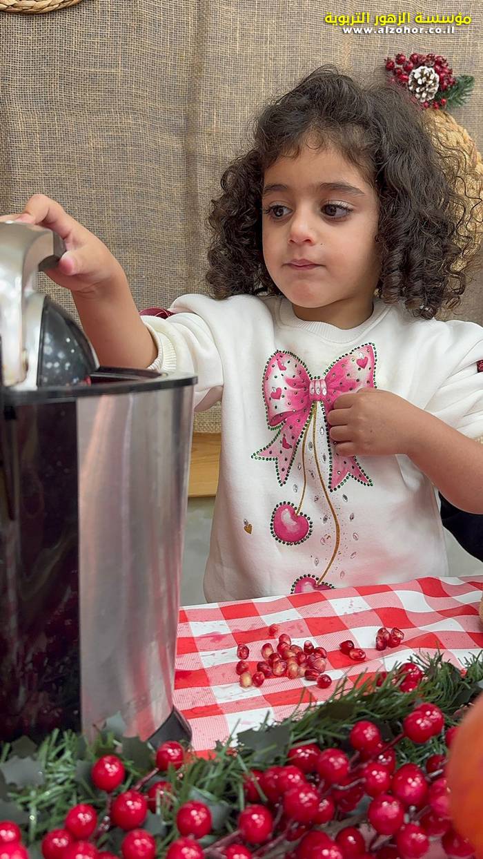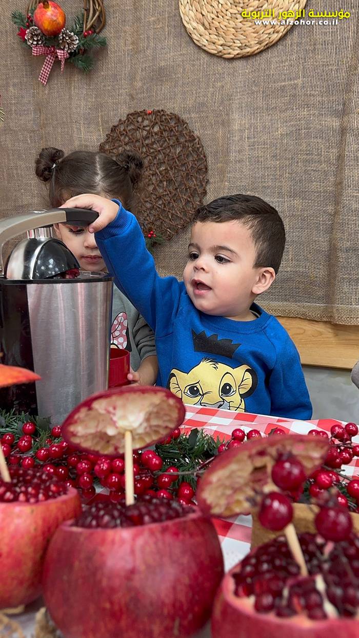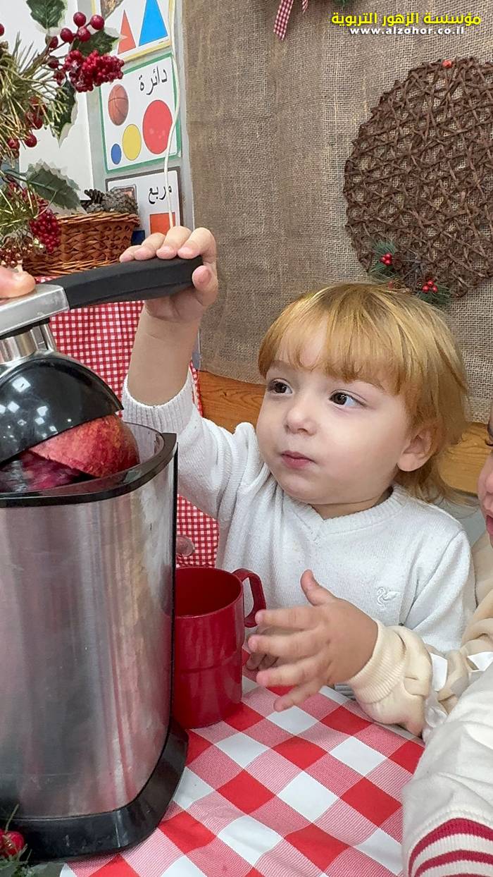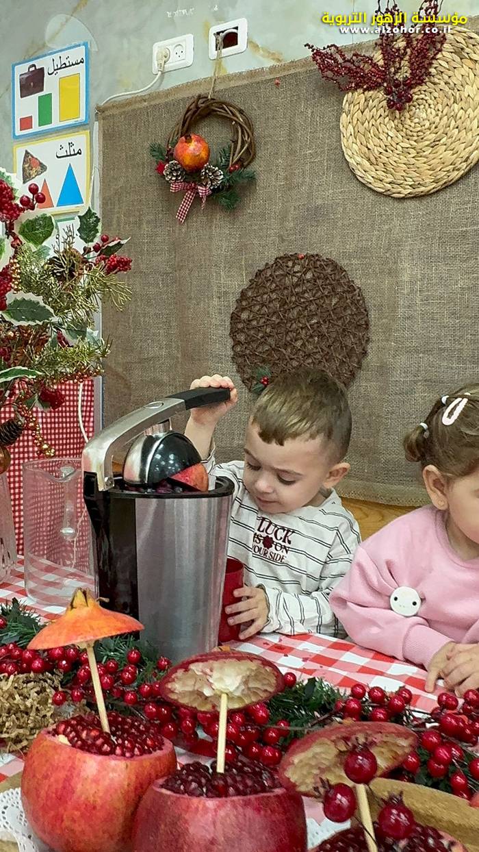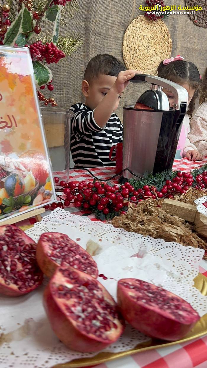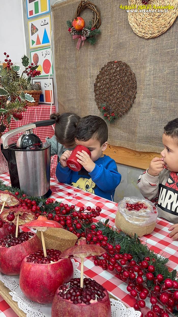 بعدها قام الأطفال بعصر حبات الرمان بأيديهم الصغيرة بكل فرح وحماس، وتذوقوا عصيرًا طبيعيًا طازجًا من صنع أيديهم 🍹