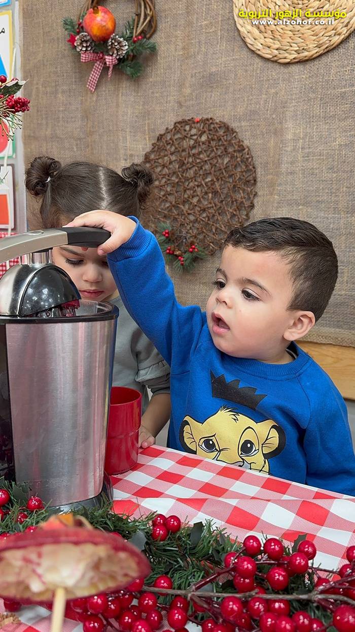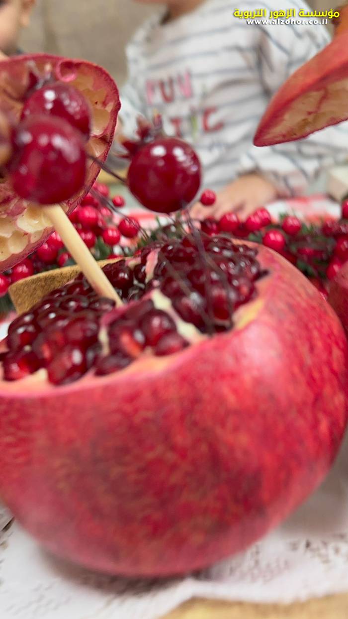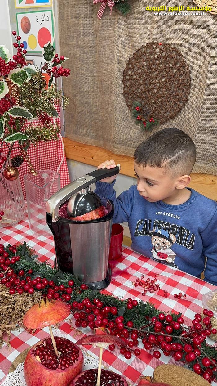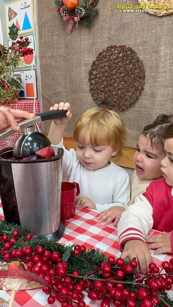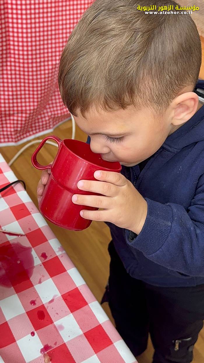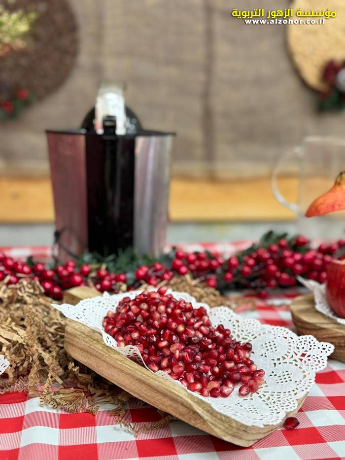بعدها قام الأطفال بعصر حبات الرمان بأيديهم الصغيرة بكل فرح وحماس، وتذوقوا عصيرًا طبيعيًا طازجًا من صنع أيديهم 🍹