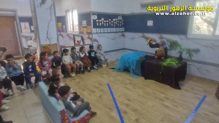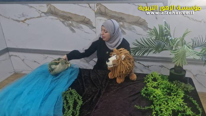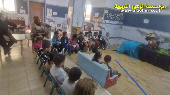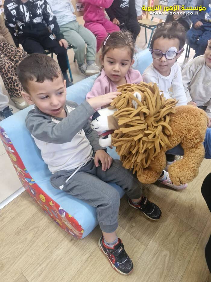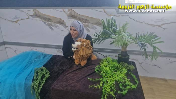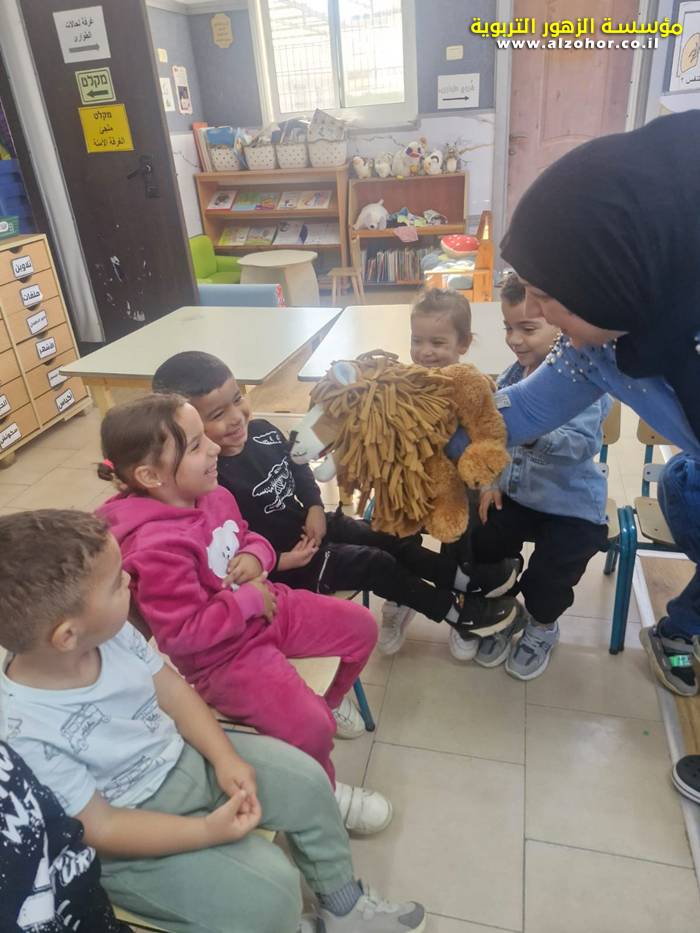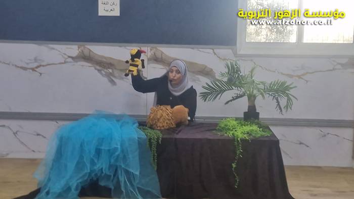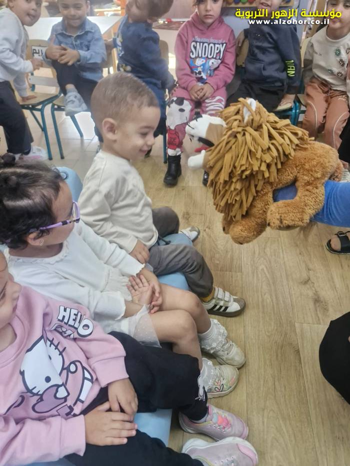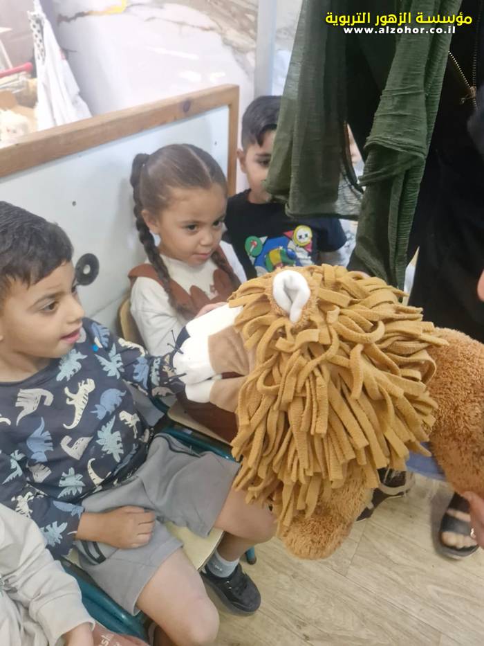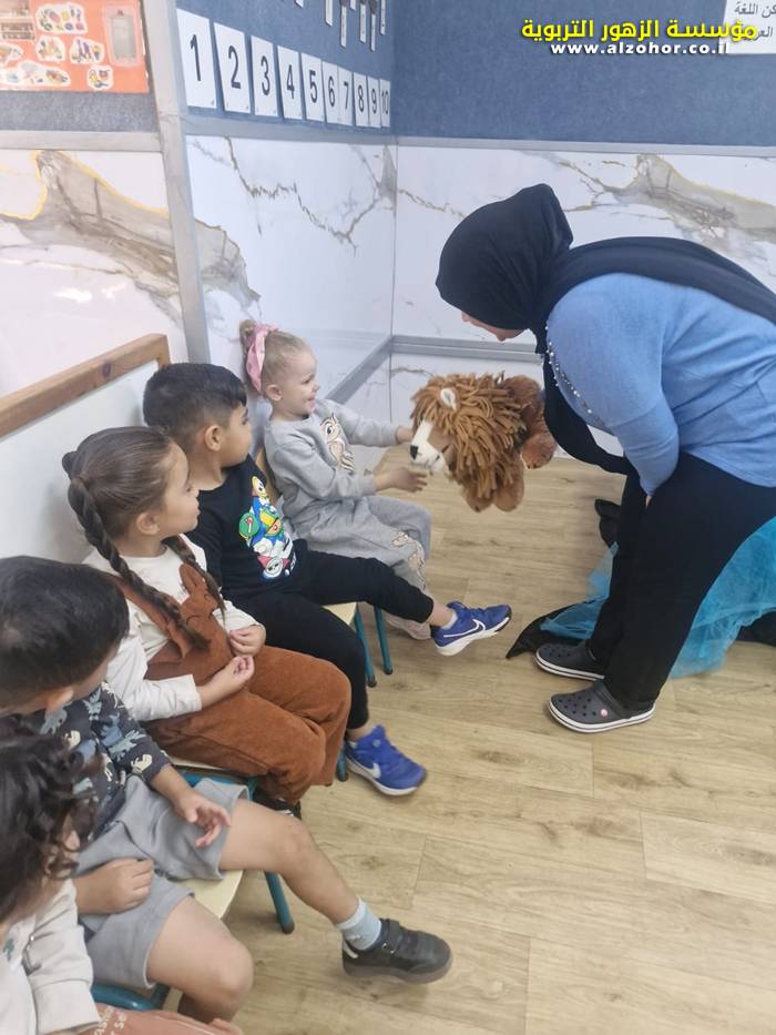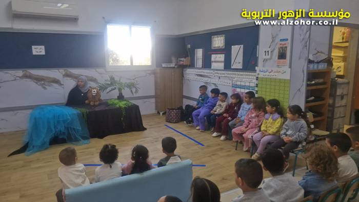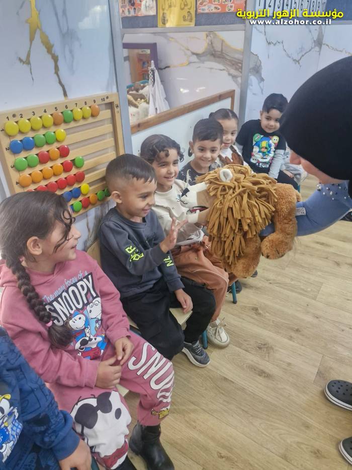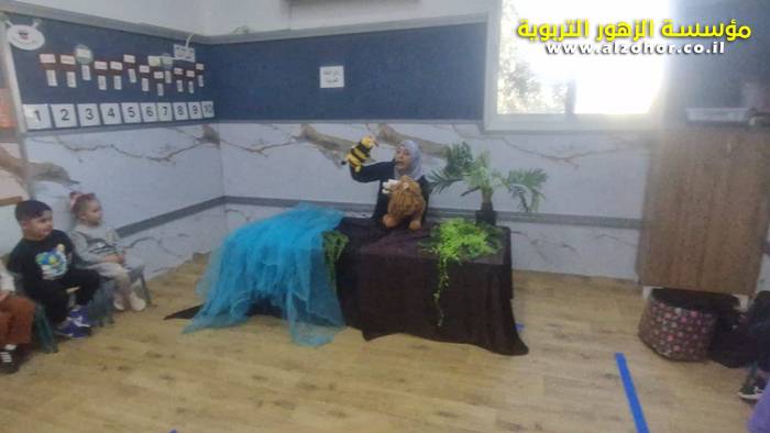 أطفال روضة الورود يستمتعون بمشاهدة عرض قصة (الاسد والنحلة) مسرح دمى